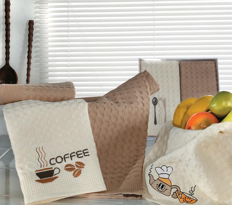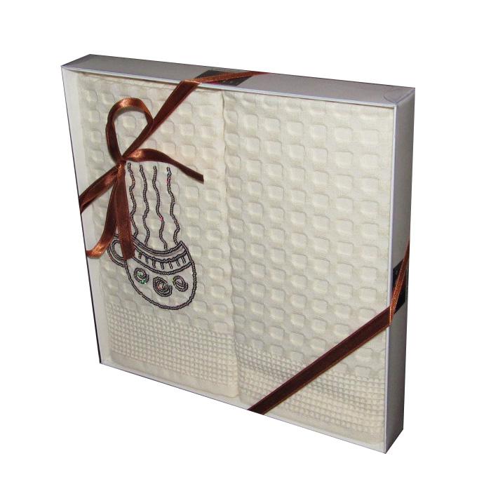 Kuchynské utierky sú balené po dva kusy v darčekovej krabici, previazané stuhou.