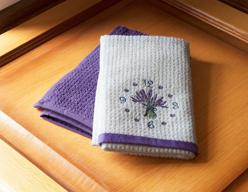 LEVANDUĽA - set utierky: 1x biela s fialovým lemom a výšivkou. 1x fialová utierka bez výšivky
