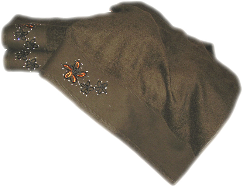 Luxusný uterák 500g, v okolí kvetu aplikované drobné ozdobné kamienky. Bezproblémová údržba.